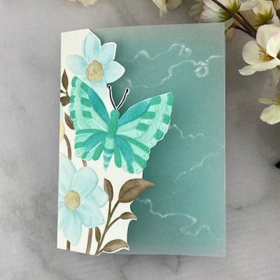 I recently attended a free class taught by Altenew Educator Evette Jacobson, aka Evie, where she gave us the idea of embossing and stenciling an image before fussy cutting it and then adding a layer of vellum behind it. Following her instructions, I took a white A2 card base and cut off most of the front panel, leaving about 3/4 of an inch to adhere the embossed panel and the vellum to.